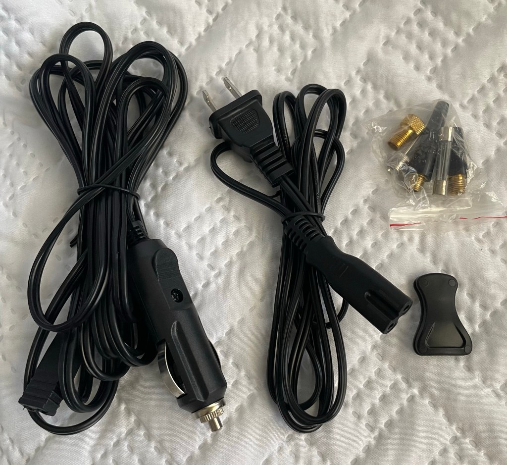 The inflator comes with two plugs…one for the car (lighter plug) and one to plug into a regular outlet. The one for the lighter plug was long enough to get to all the tires of my SUV. The regular outlet chord was a bit short. I would have to use an extension chord if I wanted to get around the car.